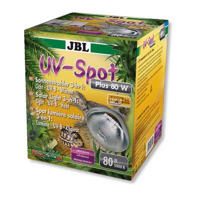 Ισχυρή λάμπα UV Spot 80W+ για terrarium ερπετών. Παρέχει απαραίτητη υπεριώδη ακτινοβολία UVB που βοηθά στην παραγωγή βιταμίνης D3 και στη διατήρηση της υγιούς ανάπτυξης των οστών. Ιδανική για ερπετά που χρειάζονται έντονη UV ακτινοβολία.